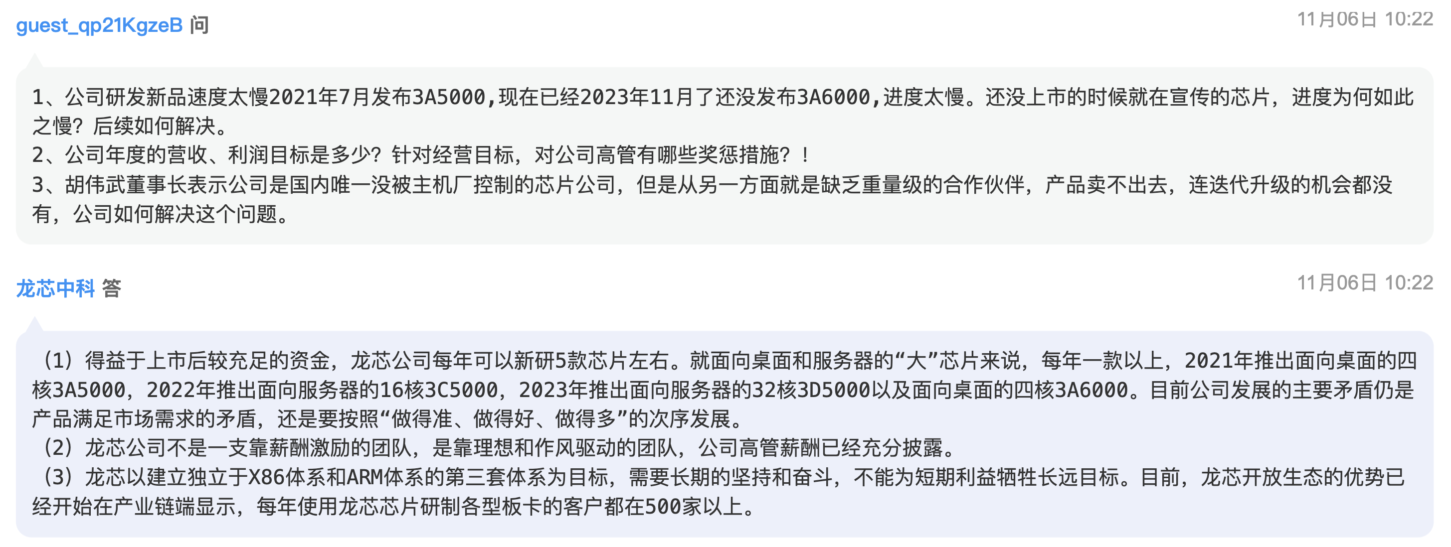 龙芯中科在业绩说明会上透露,龙芯 3A6000 将于 11 月底正式发布(初步定于 11 月 28 日),十几家整机 / ODM 企业将发布其整机产品。