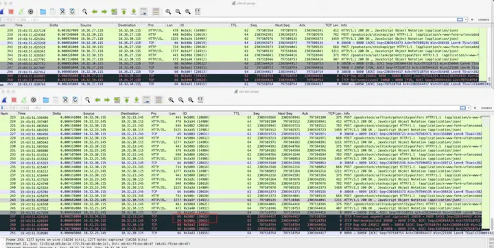 - 20623(seq=4417,ack=754),client响应的ack包:client收到server的fin,响应一个ack包;