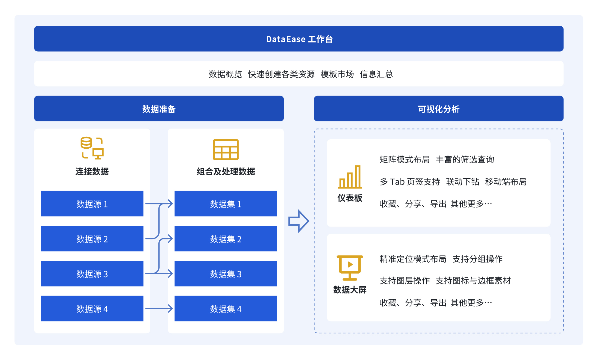 深入了解用户在DataEase v1版本中的软件使用习惯与可视化应用场景后,DataEase v2.0版本在软件的模块设计方面进行了改进与优化,以提供更加顺畅的操作手感与优秀的使用体验。