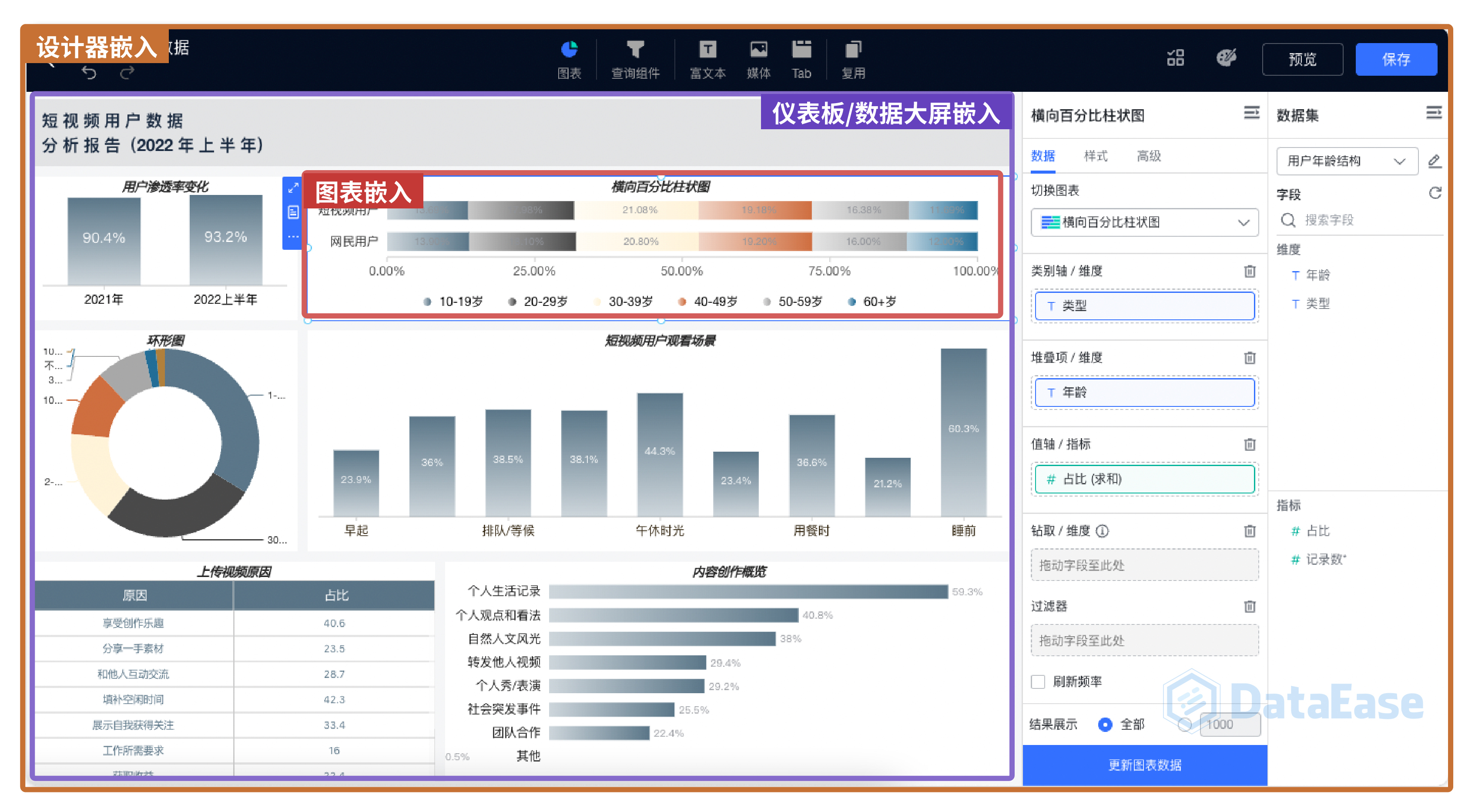 针对以上需求,DataEase v2.0版本在嵌入式方面进行了显著增强,为用户提供单一图表嵌入、仪表板或数据大屏页面嵌入和设计器嵌入三种嵌入方式,让用户可以依照自身需求将DataEase嵌入其公司系统。这样一来,用户就可以在自己的工作流程中直接访问和使用数据可视化分析功能,而无需切换至独立的应用程序。