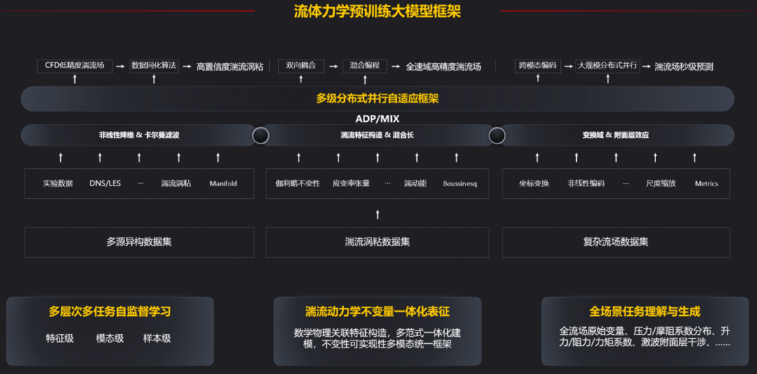 具体来说,大模型采用自研多级分布式并行自适应框架,多层级融合流体力学经典理论和人工智能方法,构造数学物理关联特征、开展多范式一体化建模、搭建不变性可实现性多模态统一框架。同时,在模型算法设计、混合精度加速,以及数值求解耦合并行优化等方面进行了创新与验证,实现了高置信度流场重构、全速域湍流场求解和复杂流场近实时预测。
