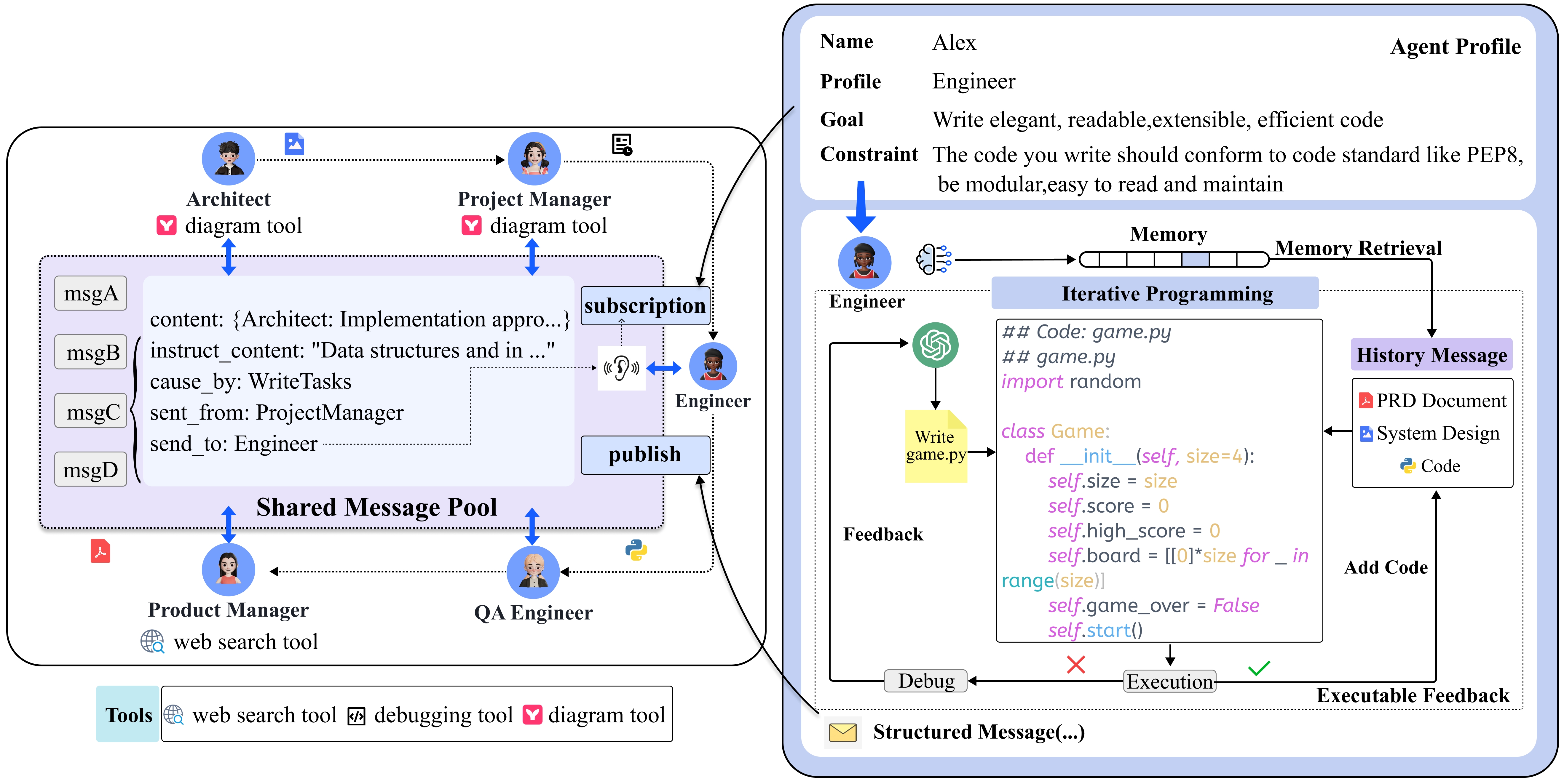 Fig.2. 通信协议示例(左)和运行中可执行反馈的迭代编程示例(右)。左图:Agents使用共享消息池发布结构化消息。它们还可以根据自己的配置订阅相关消息。右图:生成初始代码后,工程师Agent可执行代码并检查运行中是否报错。如果出现报错,Agent会检查执行结果,并将它们与 PRD、系统设计和代码文件进行比较,进行代码的重写和优化。