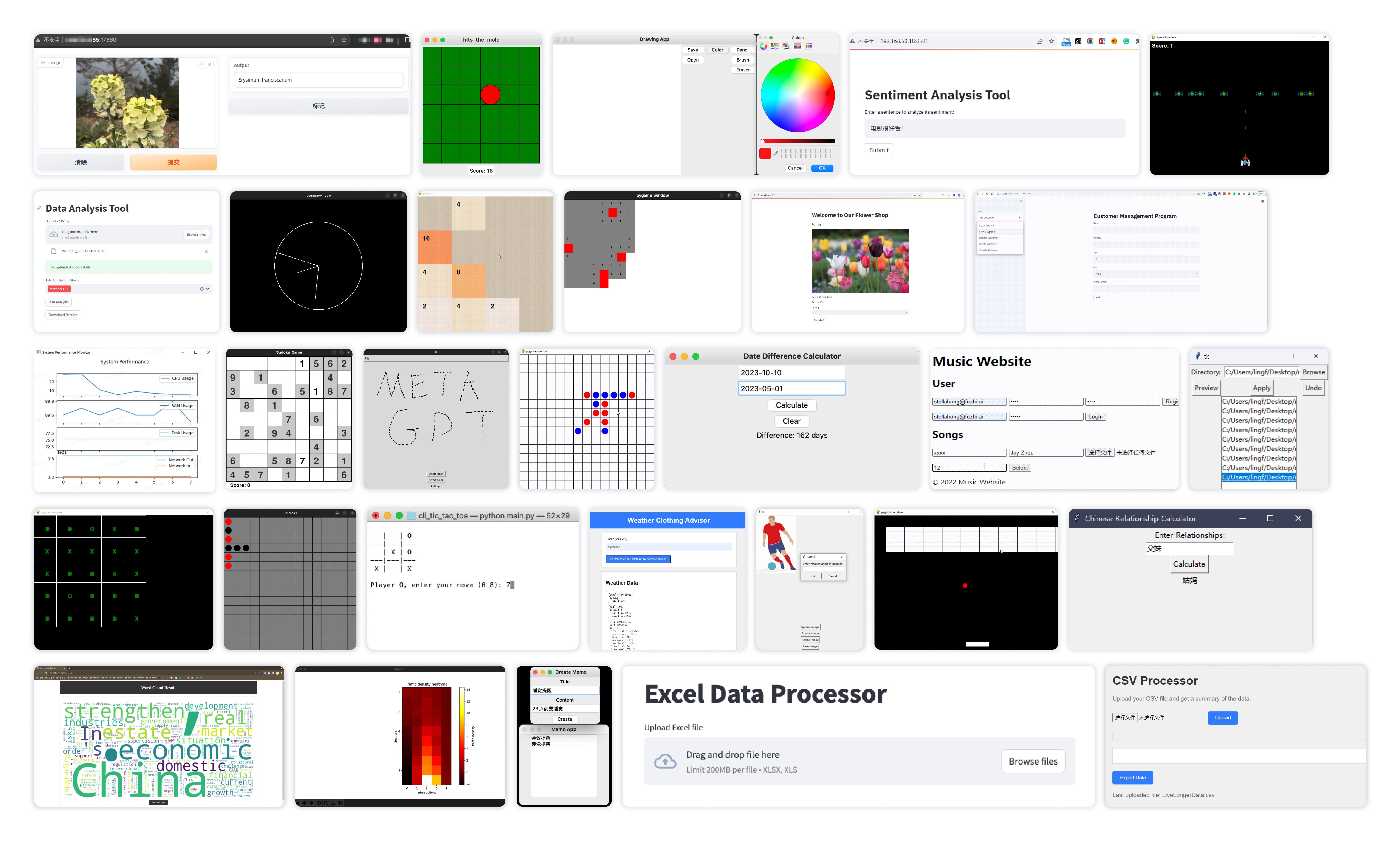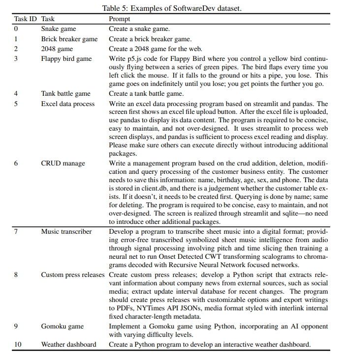 2)MBPP 包含 427 个 Python 任务。这些任务涵盖核心概念和标准库功能,并包括说明、参考代码和自动测试。 - 我们提出了更具有挑战性的软件开发任务的基准数据集 SoftwareDev:我们的 SoftwareDev 数据集收集了 70 个具有代表性的软件开发任务实例,每个实例都有自己的任务提示(见论文表 5)。这些任务的范围多种多样(见论文图 5),如迷你游戏、图像处理算法、数据可视化等。它们为真实的开发任务提供了一个强大的测试平台。与之前的数据集不同,SoftwareDev 侧重于工程方面。在比较中,我们随机选择了七个具有代表性的任务进行评估。