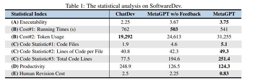 如论文表 1 所示,在具有挑战性的 SoftwareDev 数据集上,MetaGPT 几乎在所有指标上都优于 ChatDev。