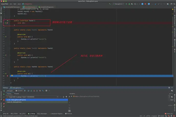 在我们的项目中,有个接口 a,但是有无数的类实现了这个接口 a,我想调试到真正执行 a 方法的地方,我该怎么做?在无数实现类中 debug 吗?我们可以将断点打在这个接口 a 方法上(当然,这个将会使你的 debug 变慢)。
