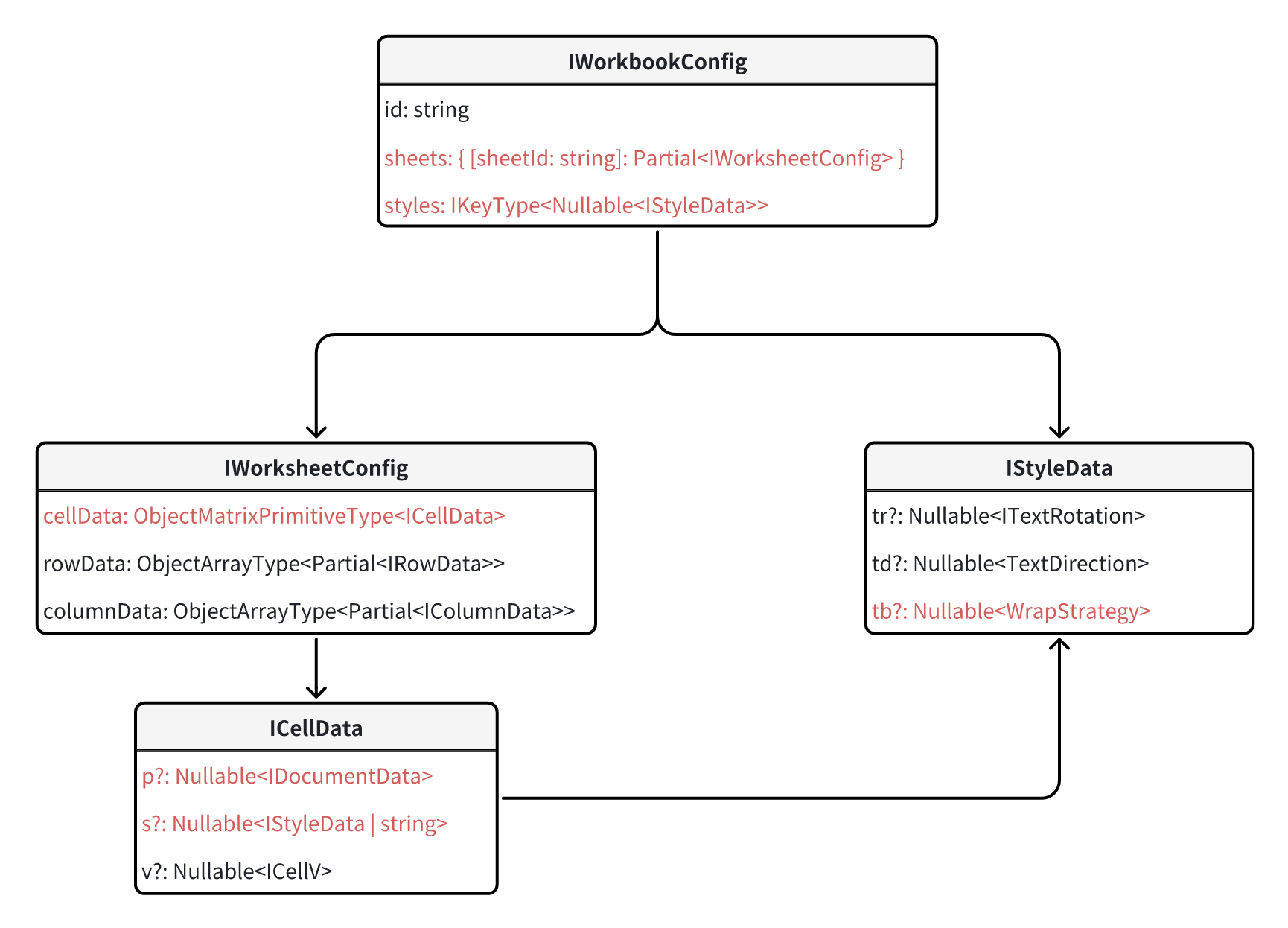 Univer sheet 整体的数据类型定义如上图所示,一个 workbook 包含多个 sheets,sheets 所引用的 styles 字段定义在了顶层 workbook 上,保证了样式的复用,减少内存开销,这也是和 Excel 保持一致。在 IWorksheetConfig 中,定义了 cellData 字段,这是一个二维矩阵,用于持久化单元格信息,也就是 ICellData 中定义的类型信息, p 是指富文本,接口类型 IDocumentData,也就是一篇 univer doc,这也是 univer 设计的独到之处,univer sheet 的每个单元格都可以转变成一个 univer doc。s 字段大多是一个字符串 id,指向 IWorkbookConfig 中 styles 字段,从中检索出该单元格的样式信息