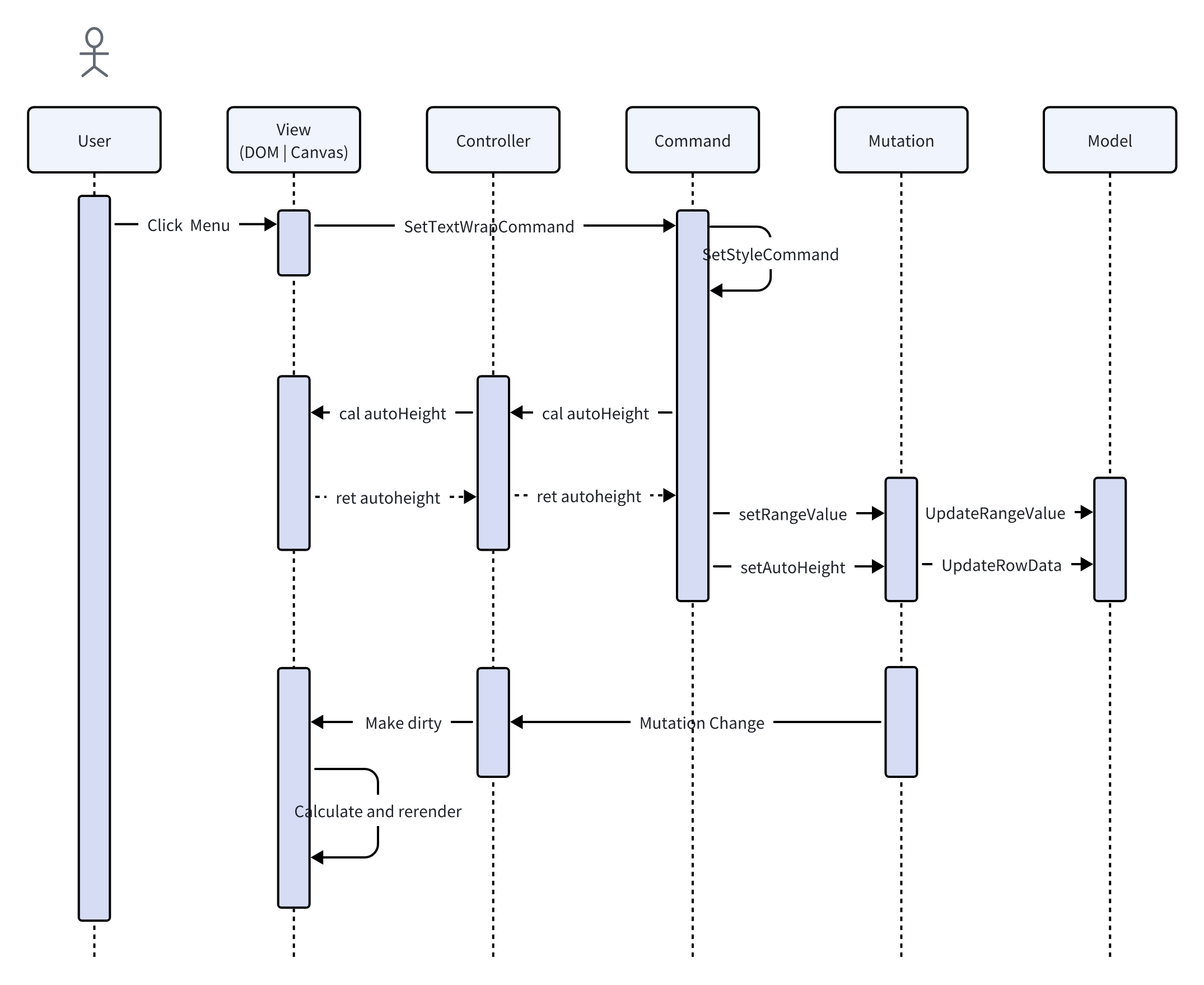 下面的时序图描述了当用户点击 text wrap 菜单项,univer 从响应事件到界面渲染的整个过程