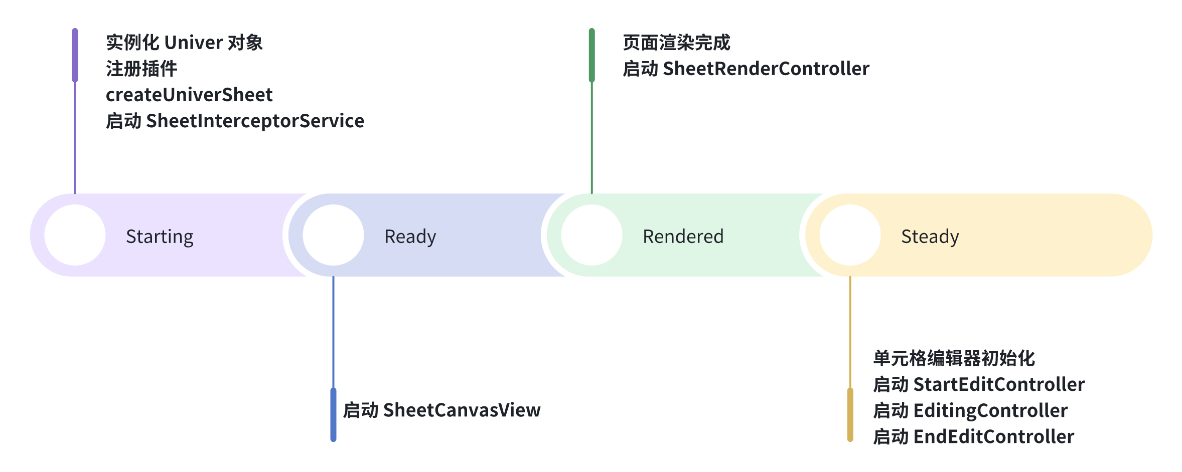 Univer 生命周期有四个阶段, Starting、 Ready、 Rendered 和 Steady。如在 Starting 阶段去注册各个插件到 univer 上面,在 Ready 阶段实例化 UniverSheet,并且执行各个插件的初始化函数,Rendered 阶段完成首次渲染,Steady 阶段,应用完成启动,用户可以使用完整功能