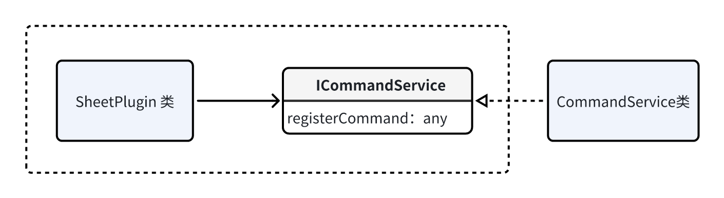 在上面的代码中,声明了 _commandService 属性拥有 ICommandService 接口,通过相关的依赖绑定,就可以在 SheetPlugin 的方法中调用 ICommandService 接口所定义的方法了。这样 SheetPlugin 依赖于 ICommandService 接口,同时 CommandService 类实现了这个接口。这样就解耦了 SheetPlugin 和 CommandService 之间的直接依赖关系,图示如下: