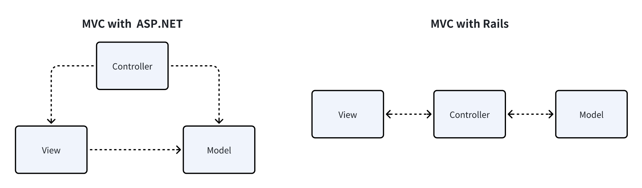 MVC 在整个 GUI 编程领域已经有了 50 多年的历史了,但是 MVC 却一直没有一个明确的定义。如上图,就是两种比较典型的 MVC 变种,在 MVC with ASP.NET 中,控制器负责管理视图和模型,当控制器改变模型层中数据后,通过一些订阅机制,视图层直接读取模型层中数据,更新视图。在 MVC with Rails 中,视图层不直接和模型层交互,通过控制器做了一层代理,视图层需要通过控制器从模型层取数据进行渲染。这样有个好处就是视图层和模型层完全的解耦,控制流会更清晰