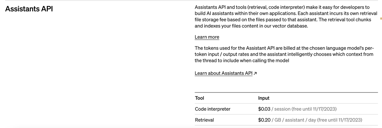 想要逆向分析 OpenAI 究竟如何实现 RAG,可以先从探究其计费策略开始。目前,Assistants API 仍处于初期阶段,关于它的信息相对有限,可以参考 OpenAI 官网关于计费的部分和一些说明: