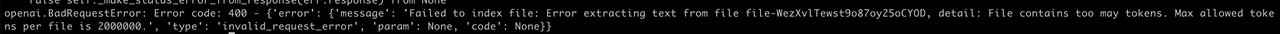 - 上传尝试和意外发现:我还尝试上传了一个 80 MB的文件,遗憾的是,这次尝试失败了。我意外发现,除了文件大小的限制,还有一个隐藏的规则——每个文件的 token 数量不能超过 2M。这意味着单个文件里的向量数量大约在 1 万以下,20 个文件加起来也就是 20 万向量,这只能打到 Zilliz Cloud 免费实例提供的范围。