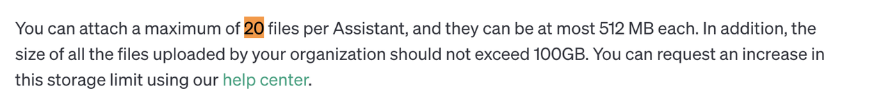 - 文档中文件数量的限制:看来 OpenAI 对文件数量有着严格的规定。每个用户只能上传 20 个文件,而且每个文件最大也就 512 MB。就算是一个组织,上传的总量也不能超过 100 GB。听起来 100 GB也够用,但这对那些需要处理海量数据的人来说,可能就有点力不从心了。