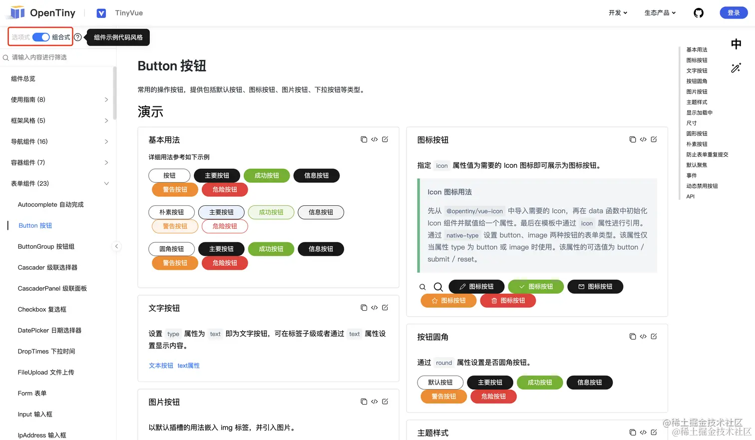 于是我们优化了文档的呈现,参考 Vue 官网,增加了 Options(选项式) 和 Composition(组合式) 两种写法的切换。