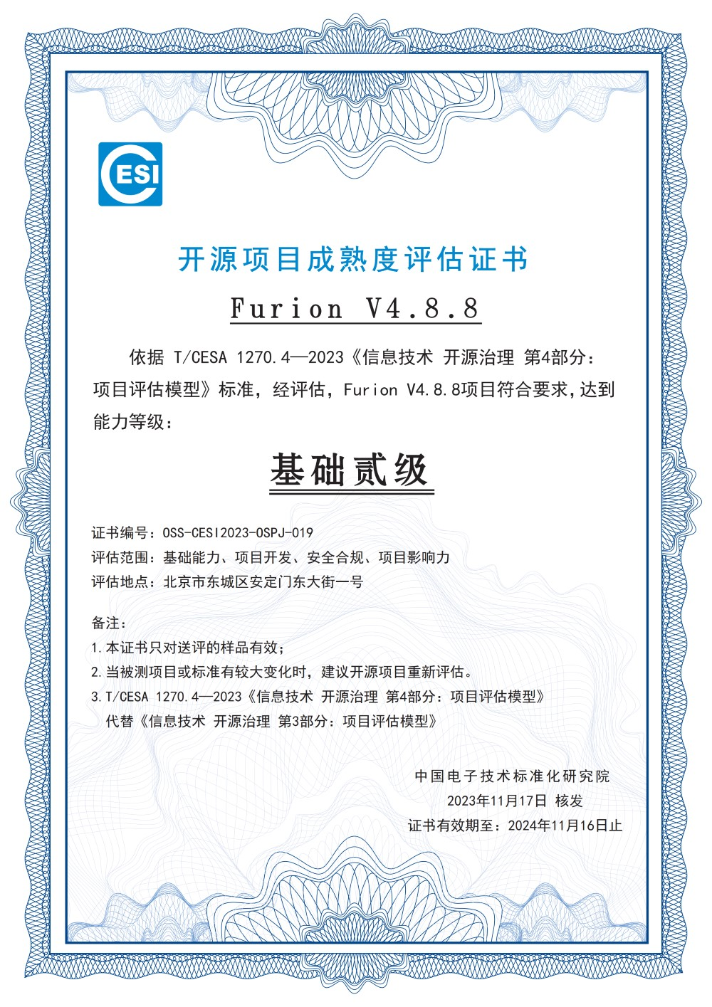 2023年11月17日,Furion v4.8.8 版本获得 中国电子技术标准化研究院 开源项目成熟度评估证书。