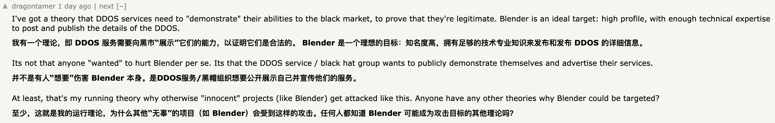 HN 上的一名网友发表了自己的看法:提供 DDoS 服务的攻击者需要向黑市“展示”能力,以证明它们自己的能力。恰好,Blender 是一个理想的目标——知名度高,团队有技术专家,而且拥有足够的技术专业知识来发布和复盘 DDoS 的详细信息。