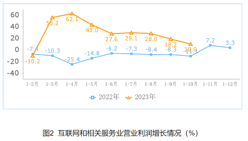 工信部最新发布的 2023 年 1-10 月份互联网和相关服务业运行情况指出,1-10 月份,互联网业务收入增速明显提升,利润总额保持两位数增幅,行业总体呈现加速增长态势。