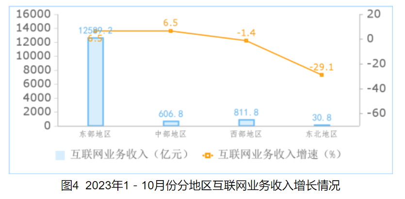中部地区互联网业务收入增速转正。1-10月份,东部地区完成互联网业务收入12589亿元,同比增长6.5%,占全国互联网业务收入的比重为89.7%。中部地区完成互联网业务收入606.8亿元,同比增长6.5%。西部地区完成互联网业务收入811.8亿元,同比下降1.4%。东北地区完成互联网业务收入30.8亿元,同比下降29.1%。