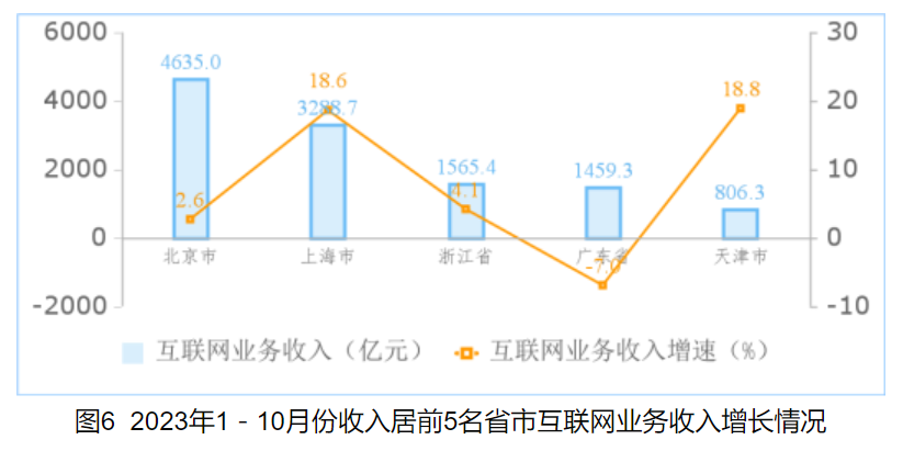 半数地区互联网业务增速实现正增长。1-10月份,互联网业务累计收入居前5名的北京(增长2.6%)、上海(增长18.6%)、浙江(增长4.1%)、广东(下降7%)和天津(增长18.8%)共完成业务收入11755亿元,同比增长6.4%,占全国(扣除跨地区企业)比重达83.7%。全国互联网业务增速实现正增长的省(区、市)有15个。