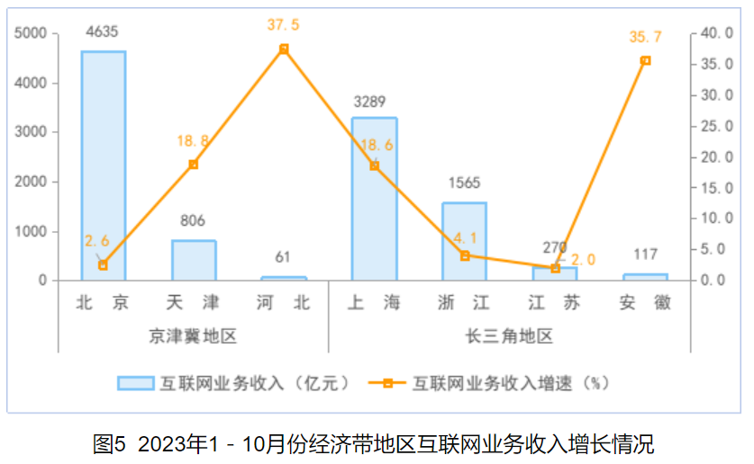 长三角地区互联网业务收入保持较快增长。1-10月份,京津冀地区完成互联网业务收入5503亿元,同比增长5%,增速较前三季度提升2.1个百分点,占全国互联网业务收入的比重为39.2%。长三角地区完成互联网业务收入5242亿元,同比增长13.2%,增速较前三季度提升0.1个百分点,占全国互联网业务收入的比重为37.3%。