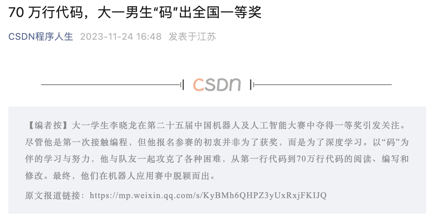 该文章介绍称,哈工大计算学部人工智能专业的一名 2022 级学生在中国机器人及人工智能大赛总决赛上获得了机器人应用赛(自动驾驶仿真)一等奖。