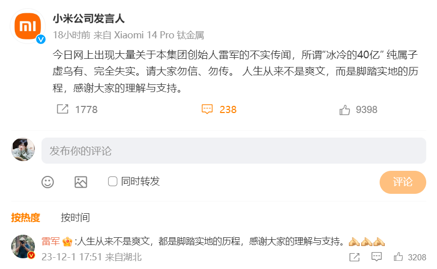 今日网上出现大量关于本集团创始人雷军的不实传闻,所谓“冰冷的40亿” 纯属子虚乌有、完全失实。请大家勿信、勿传。 人生从来不是爽文,而是脚踏实地的历程,感谢大家的理解与支持。