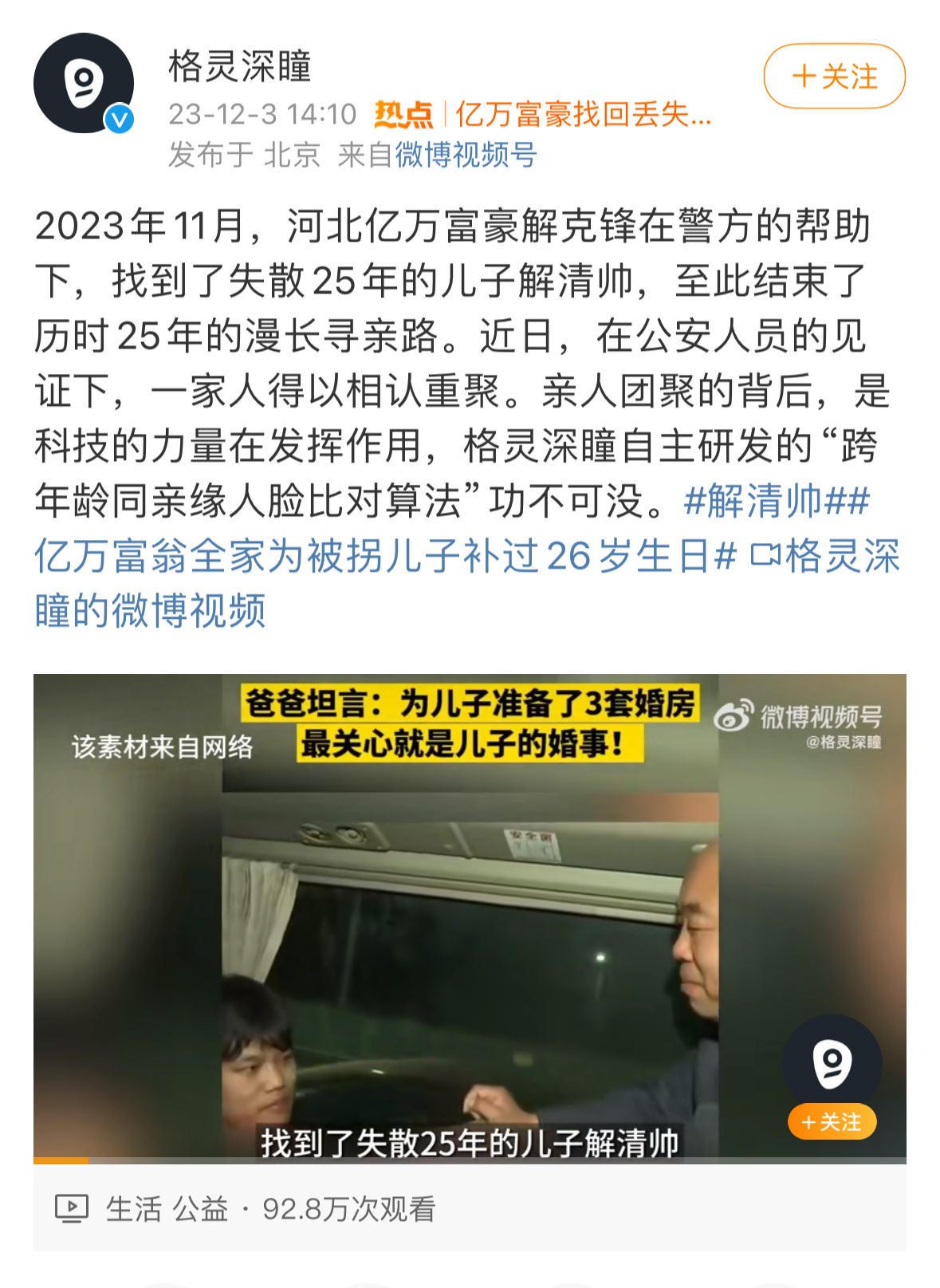 格灵深瞳在微博写道:“2023年11月,河北‘亿万富豪’解克锋在警方的帮助下,找到了失散25年的儿子解清帅,至此结束了历时25年的漫长寻亲路。近日,在公安人员的见证下,一家人得以相认重聚。亲人团聚的背后,是科技的力量在发挥作用,格灵深瞳自主研发的‘跨年龄同亲缘人脸比对算法’功不可没。”