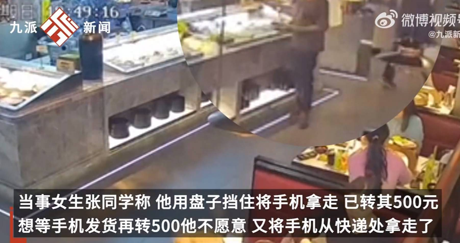 当事女生张同学称,自己回到座位上吃饭时发现手机不在身边,跟经理交流后选择报警,调监控发现是一名男子用盘子挡住将手机并将手机拿走。和对方协商后,自己已转其500元,想等手机发货再转500。对方不愿意,并将手机从快递处拿走了。