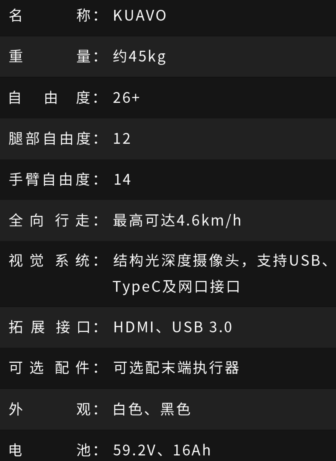 此外,“夸父” 的步态算法号称全面适配沙地、草地、障碍等多地形,采用自研一体化关节,手臂有 14 个自由度,腿部有 12 个自由度,支持 20cm 跳跃高度。