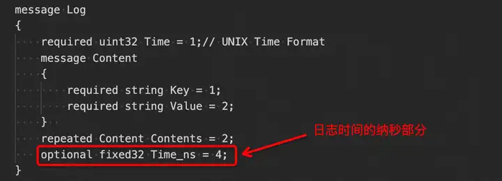 相比老的非高精度时间戳的版本,会在以下PB结构新增了一个可选的Time_ns字段, 在开启高精度时间戳功能的时候,用来存放日志时间里面的纳秒部分。之所以新增这么一个字段, 而没有修改Time字段的类型主要是为了兼容历史数据。