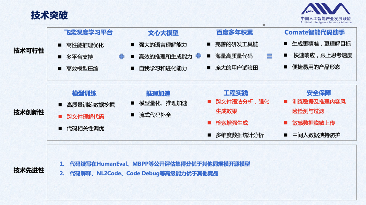 在技术创新优势上,依赖文心大模型、飞桨深度学习平台以及百度多年积累的技术经验,Comate智能代码助手具备模型训练、推理加速、工程实践和安全保障四重技术创新,并在代码续写、代码解释、NL2Code、Code Debug等能力上领先行业与竞品。