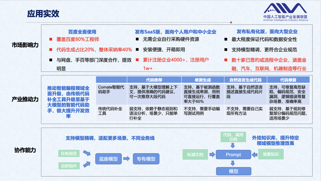 在应用实效上,基于模型层多种能力,百度Comate具有优秀的代码推荐、单测生成、自然语言代码生成和代码修复等能力;并通过开放SaaS版和私有化部署能力,满足个人用户、中小企业和大型企业的不同需求。在百度内部,通过Comate生成代码占比20%,整体采纳率达40%;SaaS版开箱即用,注册企业累计4000+,注册用户超10000;涵盖金融、汽车、互联网、高端制造等在内的数十家大型企业已与Comate达成私有化部署合作。