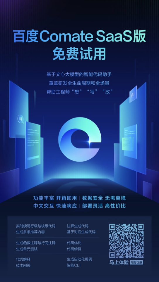 从在百度内部全面落地应用,到面向企业开发者发布“国内首个商用全场景智能编程助手”,再到SaaS版全面开放,百度Comate厚积薄发,持续引领AI原生研发新范式。