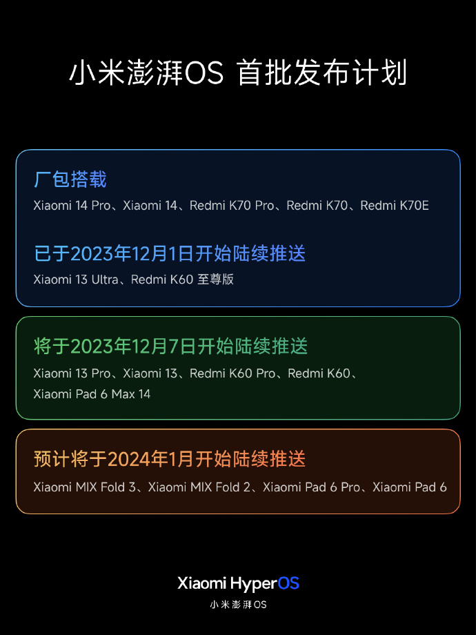 Xiaomi MIX Fold 3、Xiaomi MIX Fold 2、Xiaomi Pad 6 Pro、Xiaomi Pad 6 则预计于 2024 年 1 月开始陆续推送。