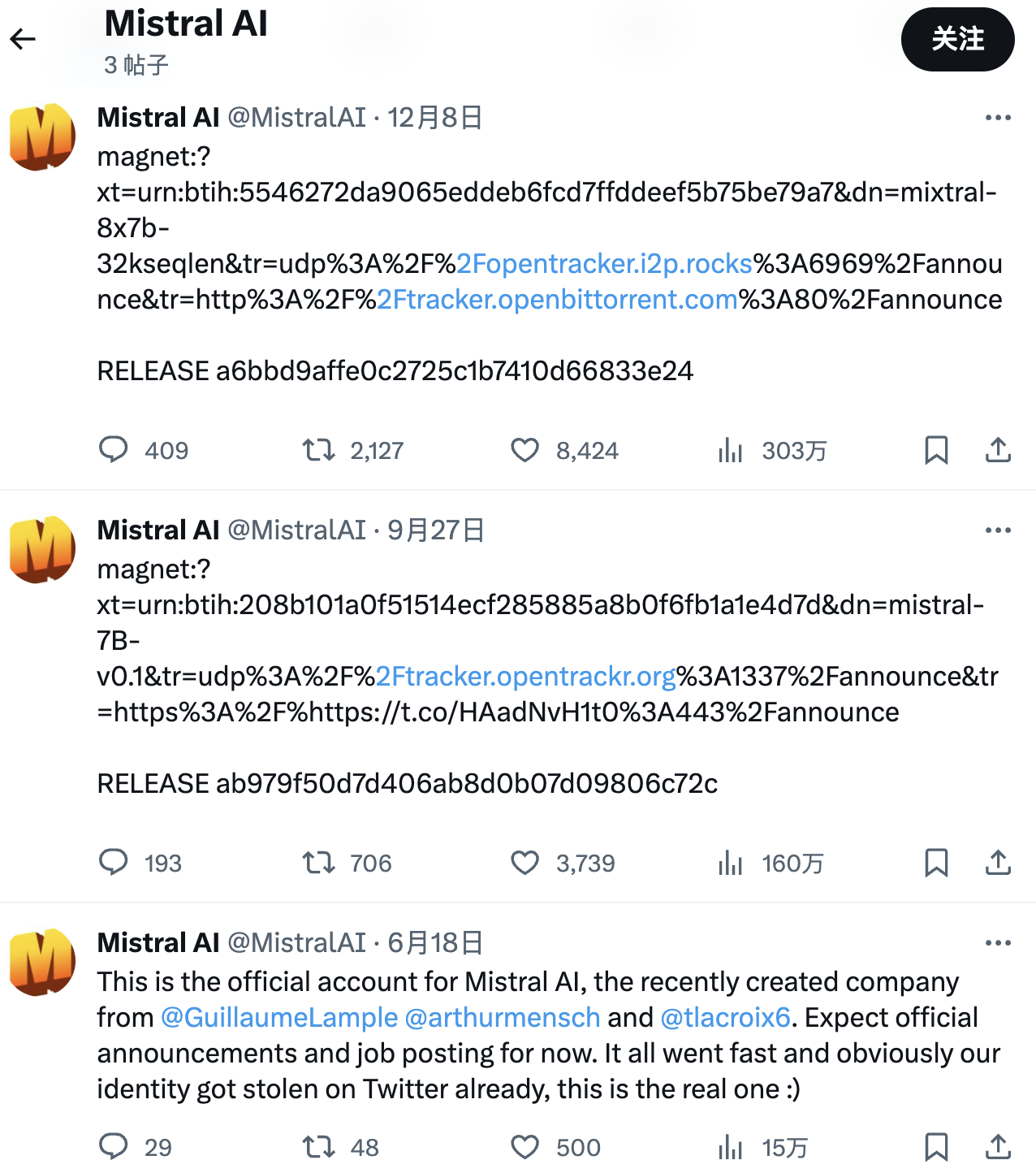 有“欧洲版 OpenAI”之称的大模型创业公司——Mistral AI 昨天发布了一条仅包含磁力链接的推文:
