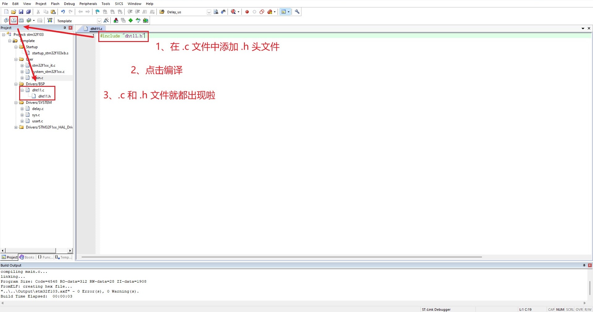 DHT11 对时序要求严格,需要微妙级延时,我们常用的 HAL_Delay() 是毫秒级时延。实现微秒级延时的方法有很多,但是我们可以直接用模板工程中 delay 文件的 delay_us。