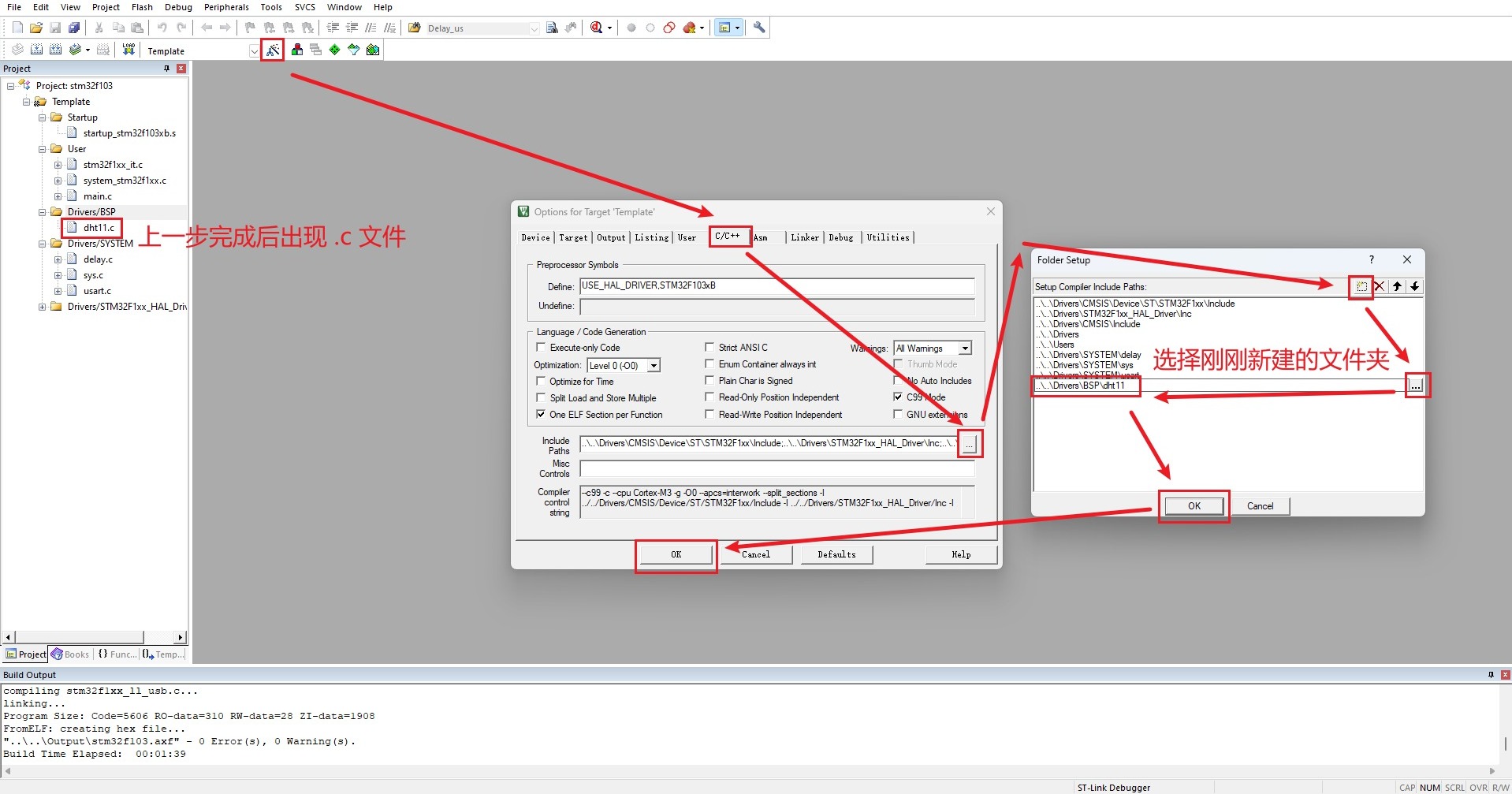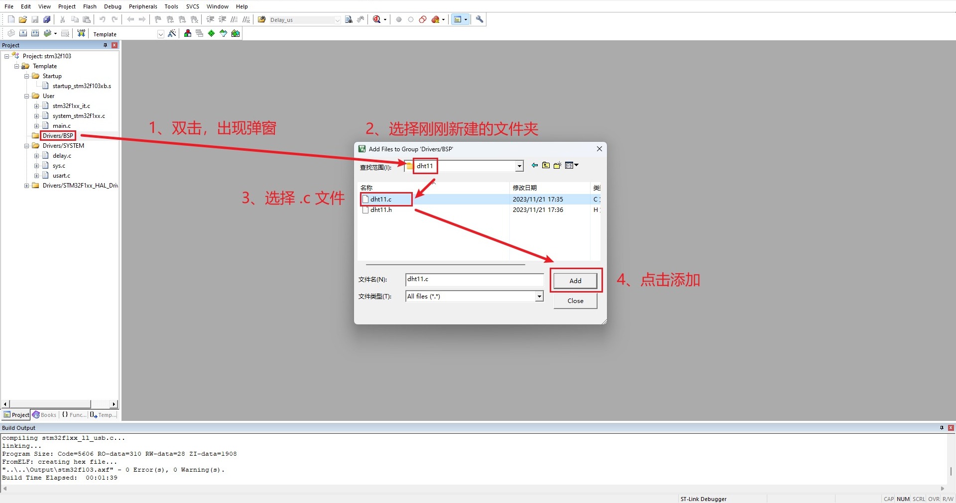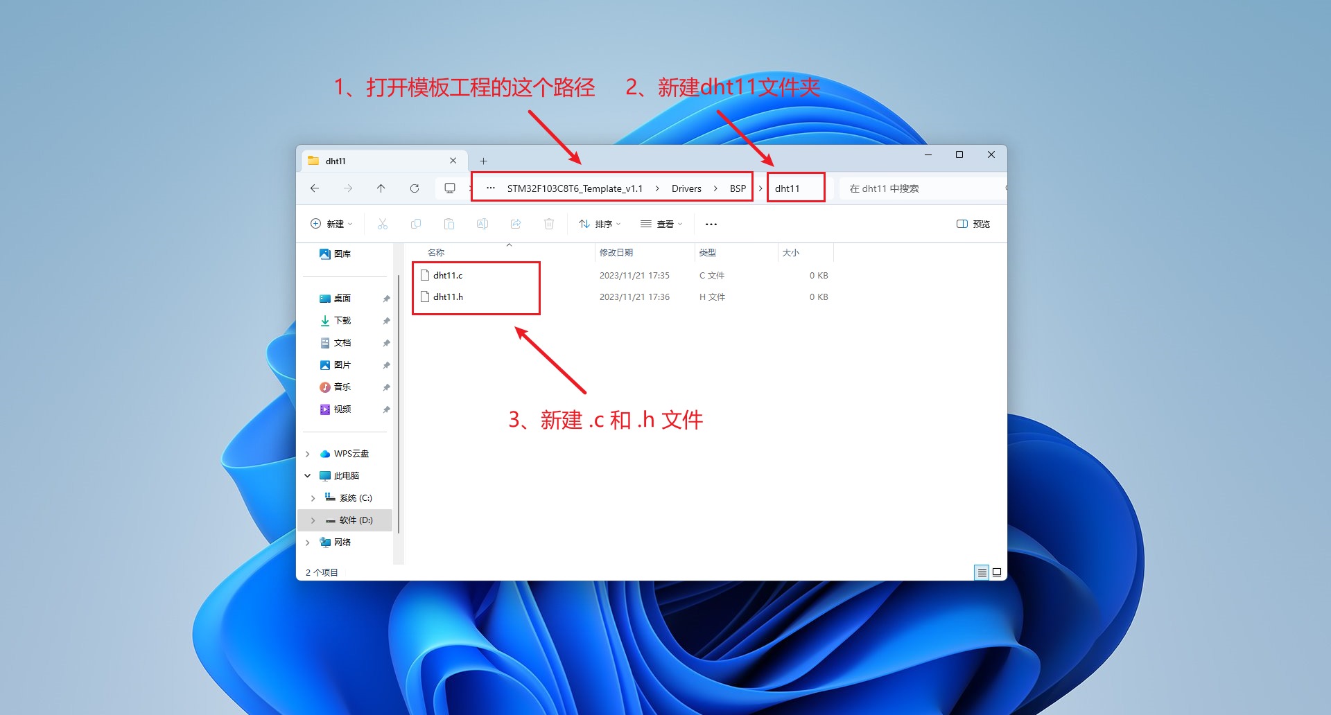 我们在模板工程里的 BSP 目录下创建一个 dht11 目录,然后创建 dht11.c 及 dht11.h 两个空文件。
