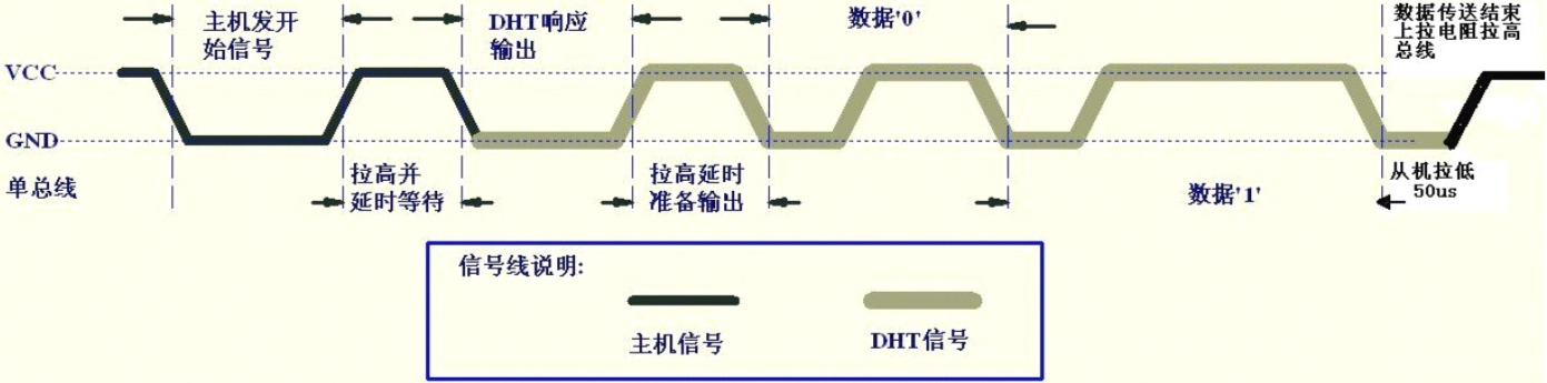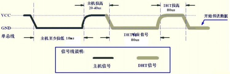 总线空闲状态为高电平,主机拉低总线等待 DHT11 响应, 主机把总线拉低必须大于 18ms,保证 DHT11 能检测到起始信号;