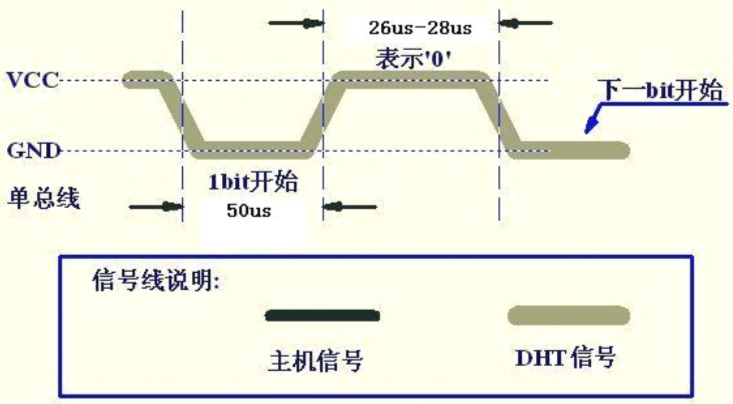 以 50us 低电平开始,高电平持续 26~28us 表示 0。