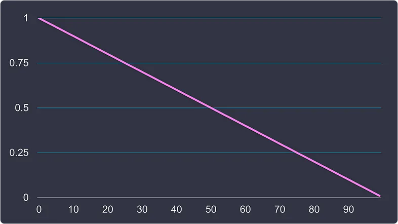 先选择线性衰减的方案。在此之前,让我们来看看任意参数下的曲线是什么样子的。从 ε = 1 开始,进入完全探索模式,并在每个游戏回合后将该值减少 0.001。