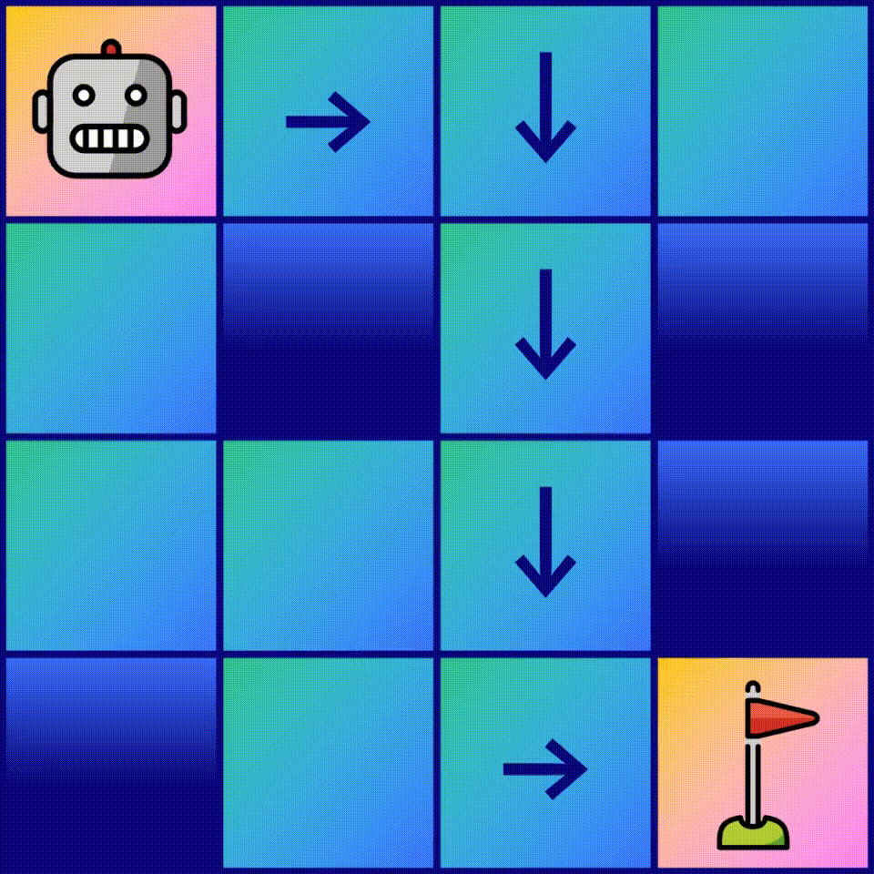 - AI或agent可以执行4种动作:向左移动◀️,向下移动🔽,向右移动▶️,或向上移动🔼。