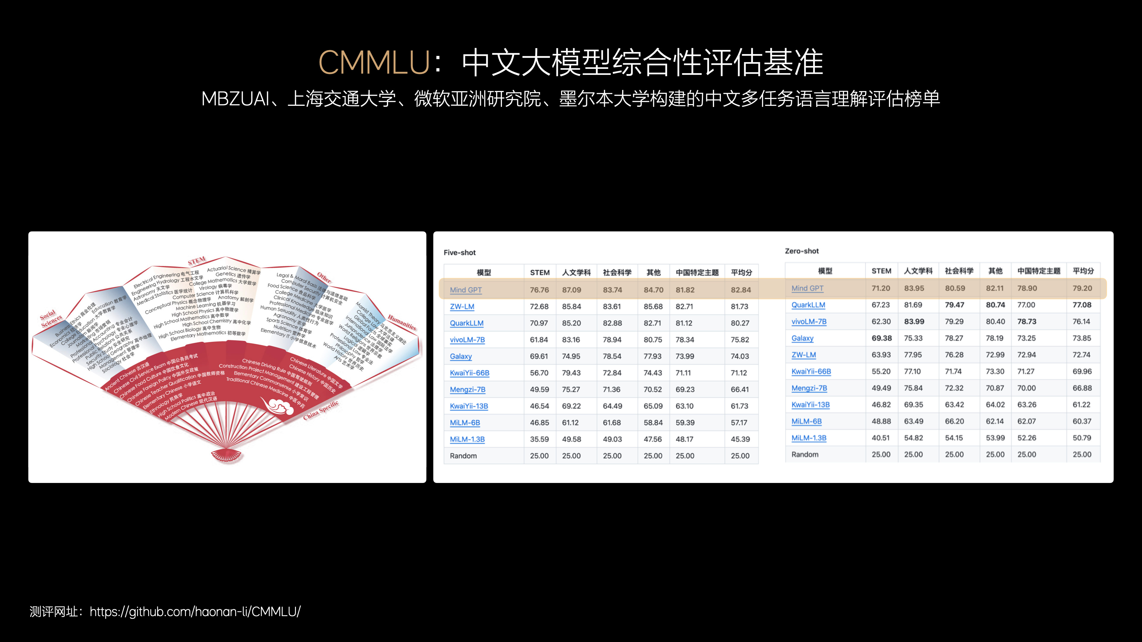 官方称在目前国内极具权威性的,中文大语言模型评测榜单 C-EVAL,覆盖了人文、社科、理工等多个方向共 52 个学科,Mind GPT 在 58 个参加测评的大模型中排行第一名;同时,还有涵盖从基础学科到高级专业包含 67 个主题领域的评测榜单 CMMLU,Mind GPT 也获得第一名,拿下了双冠军。