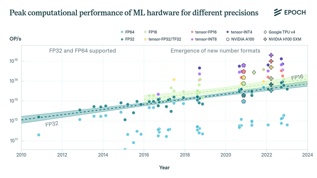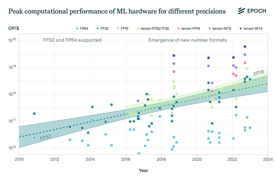 从历史上看,近20年来,FP32精度的计算性能趋势一直相对稳定,呈现出2.3年翻倍一次的趋势,与摩尔定律的速度密切相关。在过去几年,特别是自2016年以来,我们已经看到了专门支持FP16精度的硬件的出现,这增加了绝对计算性能,同时减少了位长。