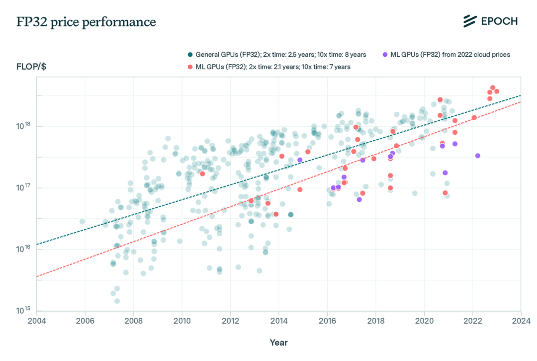图 6:通用硬件和ML硬件的FP32性价比轨迹。我们发现,这些轨迹大致遵循与峰值计算性能相同的增长轨迹(2.3年翻倍时间)。此外,我们发现ML GPU的绝对性价比低于其他硬件。FP32性价比可能存在对ML硬件的偏见(详见正文)。