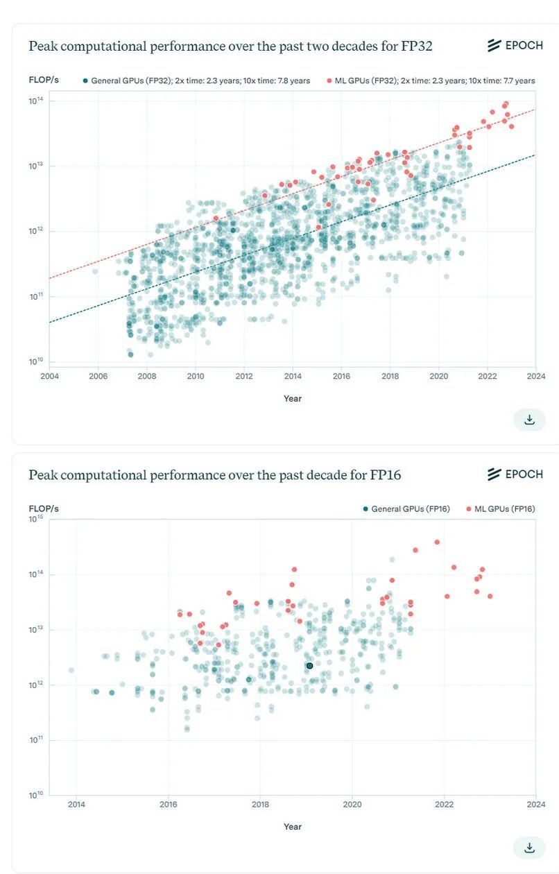 图2:过去二十年,FP32和FP16精度下的通用和ML GPU峰值性能。上图显示,ML GPU的中位性能高于所有通用GPU,但增长率相似。下图显示,2014年一些硬件加速器开始提供FP16性能细节。