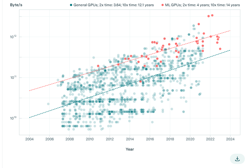 内存容量每4年翻一番,内存带宽每4.1年翻一番。它们的增长速度比计算性能慢(计算性能每2.3年翻一番)。这是一个常见发现,通常被称为内存墙(memory wall)。