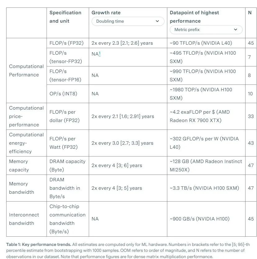表1:关键性能趋势。所有估算仅针对机器学习硬件。方括号中的数字表示通过1000次bootstrap采样得出的[5; 95]百分位估算。OOM代表数量级,N表示数据集中的观测次数。请注意,性能数据是指稠密矩阵乘法性能。