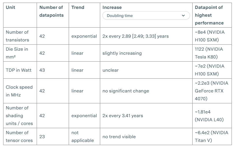 我们研究了GPU在不同数值表示、内存容量、带宽以及互连带宽方面的计算性能,使用的数据集包括2010年到2023年常用于机器学习实验的47个ML加速器(GPU和其他AI芯片),以及2006年到2021年的1948个GPU。主要发现如下: