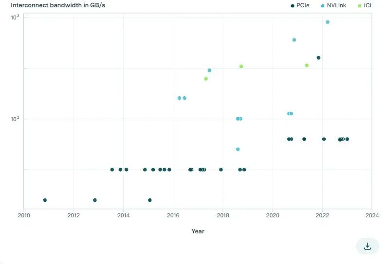 我们发现,自2011年以来,ML(机器学习)硬件的PCIe带宽仅从32GB/s增加到2023年的128GB/s(见图5)。[20]然而,英伟达(NVLink)和谷歌(ICI)的专用加速器互连协议可实现更高的互连带宽。此外,常用于大型计算集群的高端ML加速器(例如TPU和V/A/H100)拥有迄今为止最高的互连速度。例如,搭载18个NVLink 4.0通道的英伟达H100实现了900GB/s的带宽,是单个PCIe 5.0 16通道链路的7倍。[21]