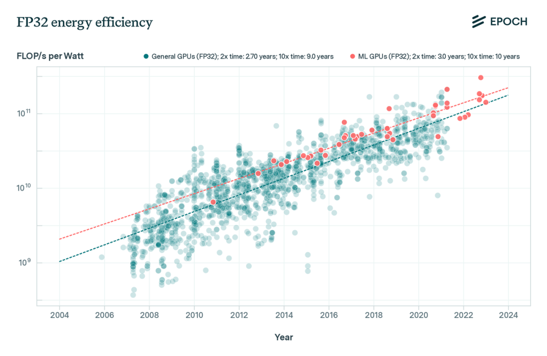 图 8:根据TDP数值计算的FP32精度能效轨迹。我们发现,机器学习GPU的平均能效比通用GPU高,且能效的增长速度略低于峰值计算性能(2.3年翻倍时间)的增长速度。